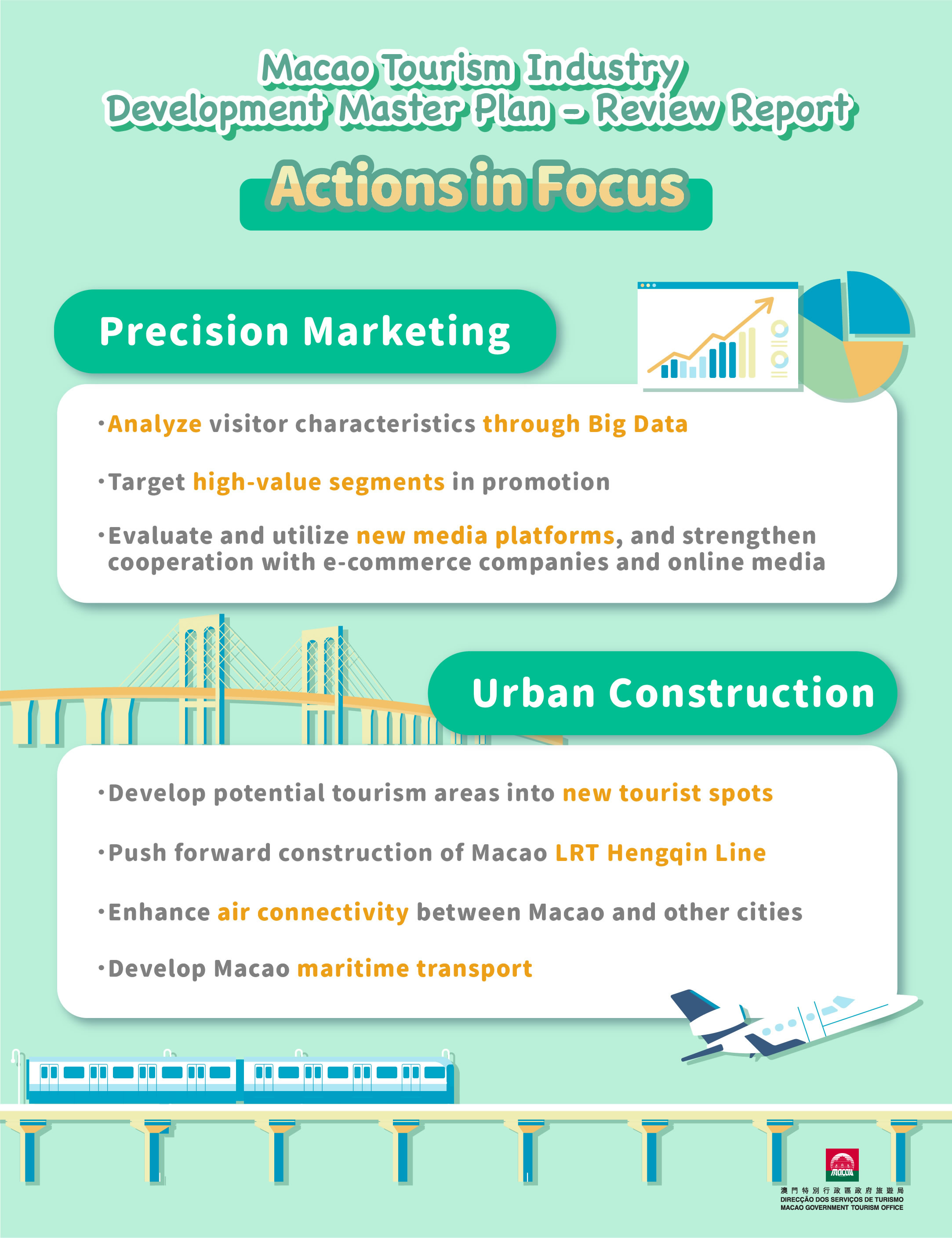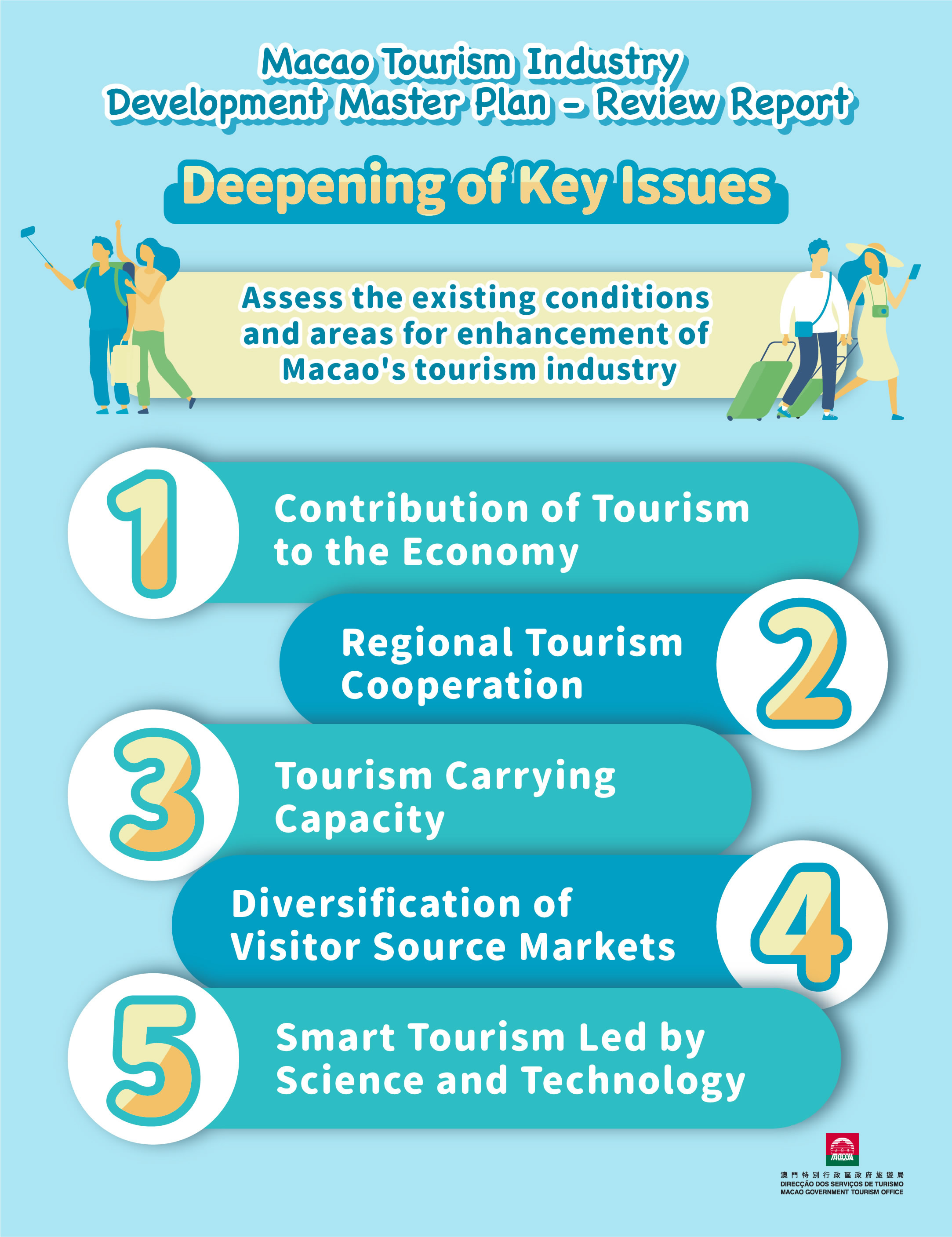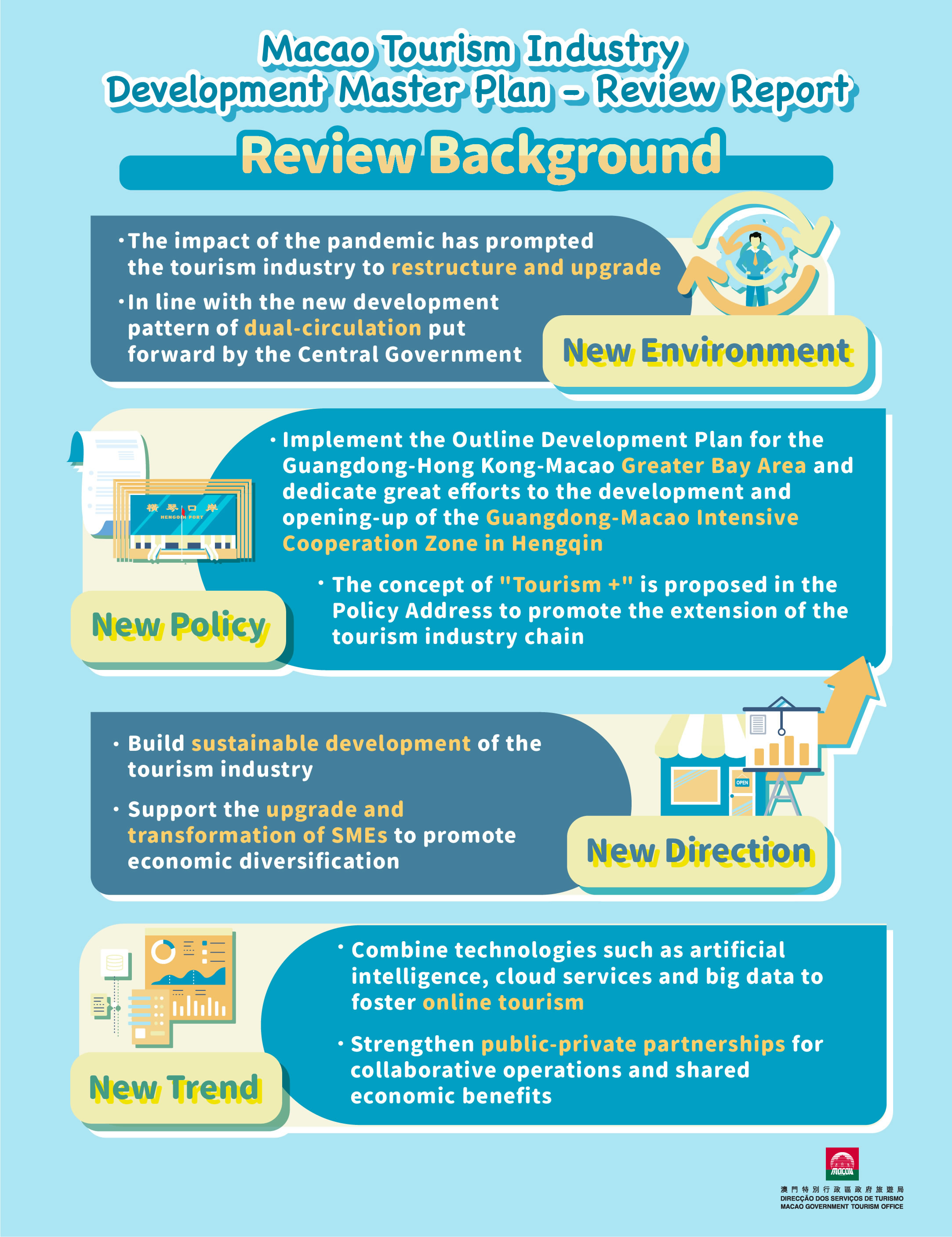 In recent years, with the guiding directions put forward by the national and the Macao SAR Government’s policies and plans, coupled with the changes in the tourism environment and tourism patterns brought about by the pandemic, the external and internal environment of Macao's tourism industry has changed. Besides, the Macao Tourism Industry Development Master Plan has also proposed an evaluation mechanism to conduct timely adjustments to the key objectives and action plans to meet the latest development of Macao's tourism industry.