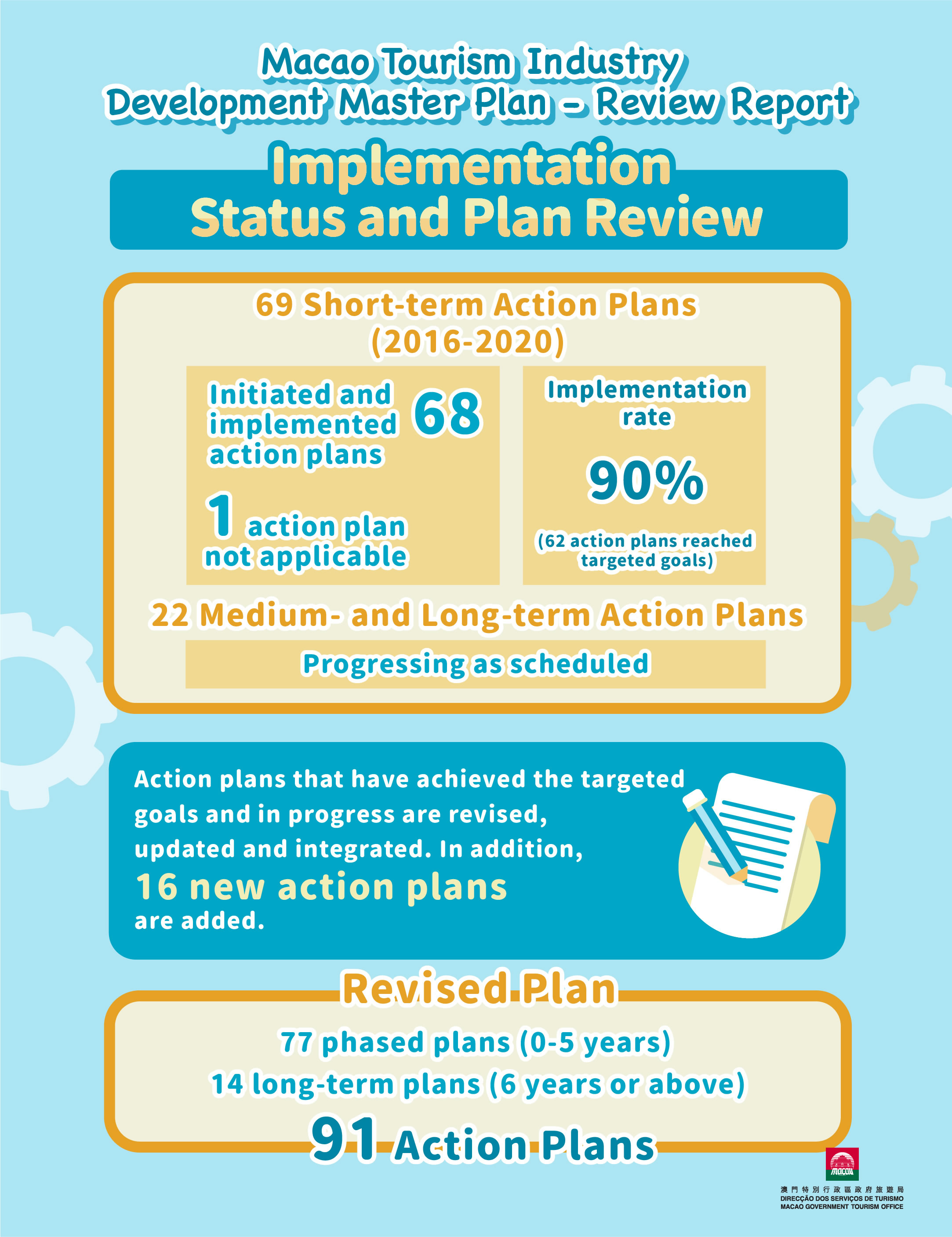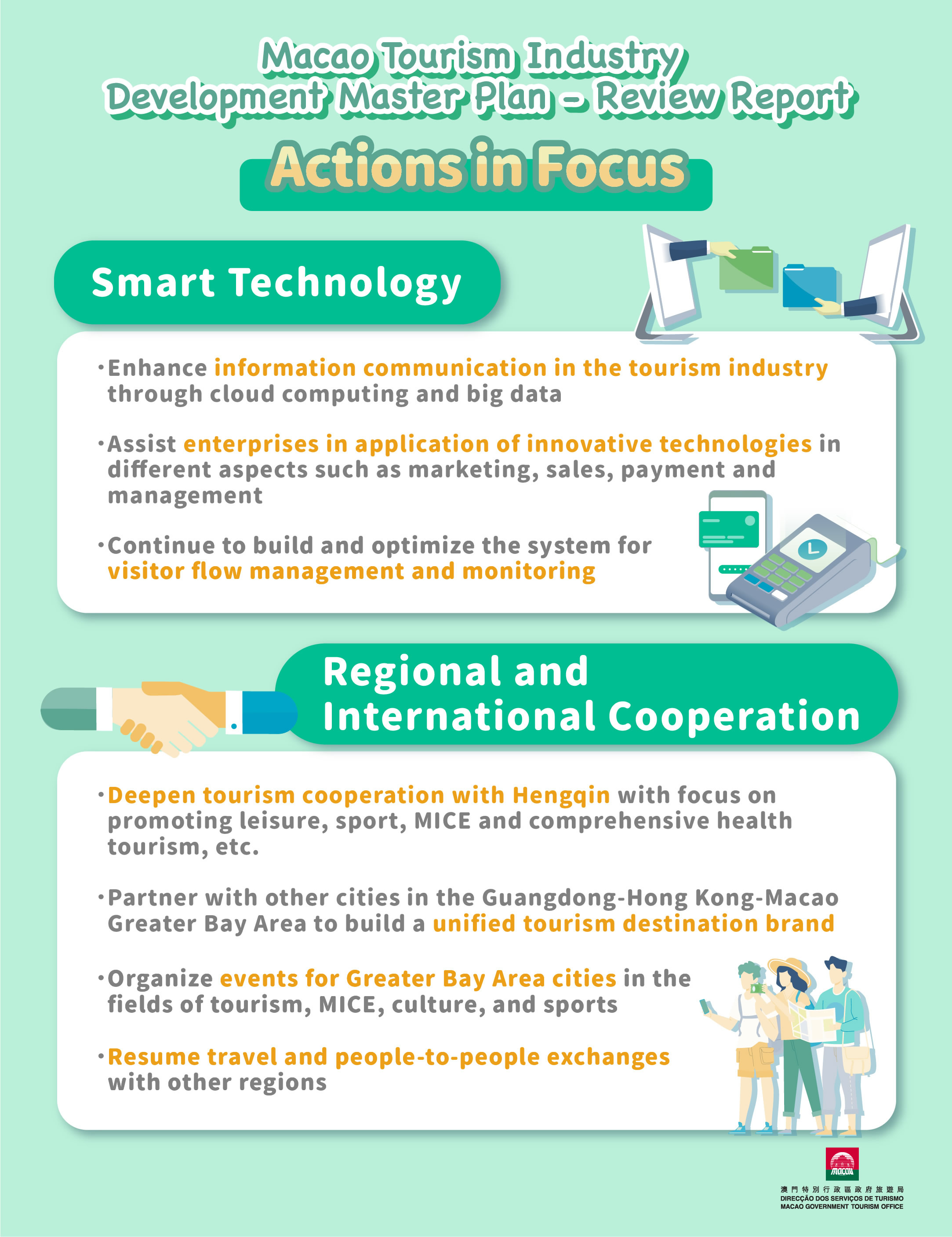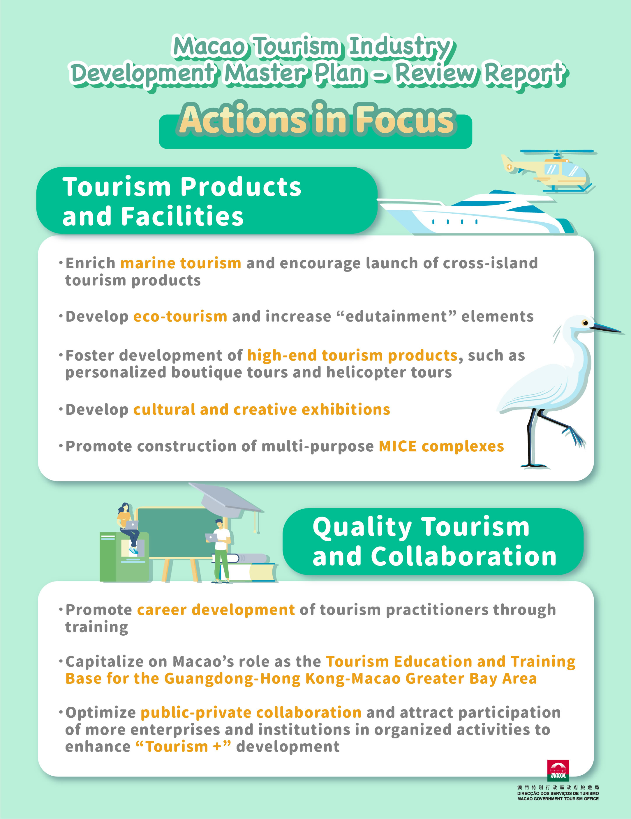 Therefore, at the end of year 2020, the Macao Government Tourism Office initiated a review for the Macao Tourism Industry Development Master Plan to evaluate the development status of the tourism industry, as well as to propose key directions and focus for future implementation, which will ensure the conformity with the principles set out by the national and Macao SAR Government’s future development plan. The Review Report is completed in the year 2021.